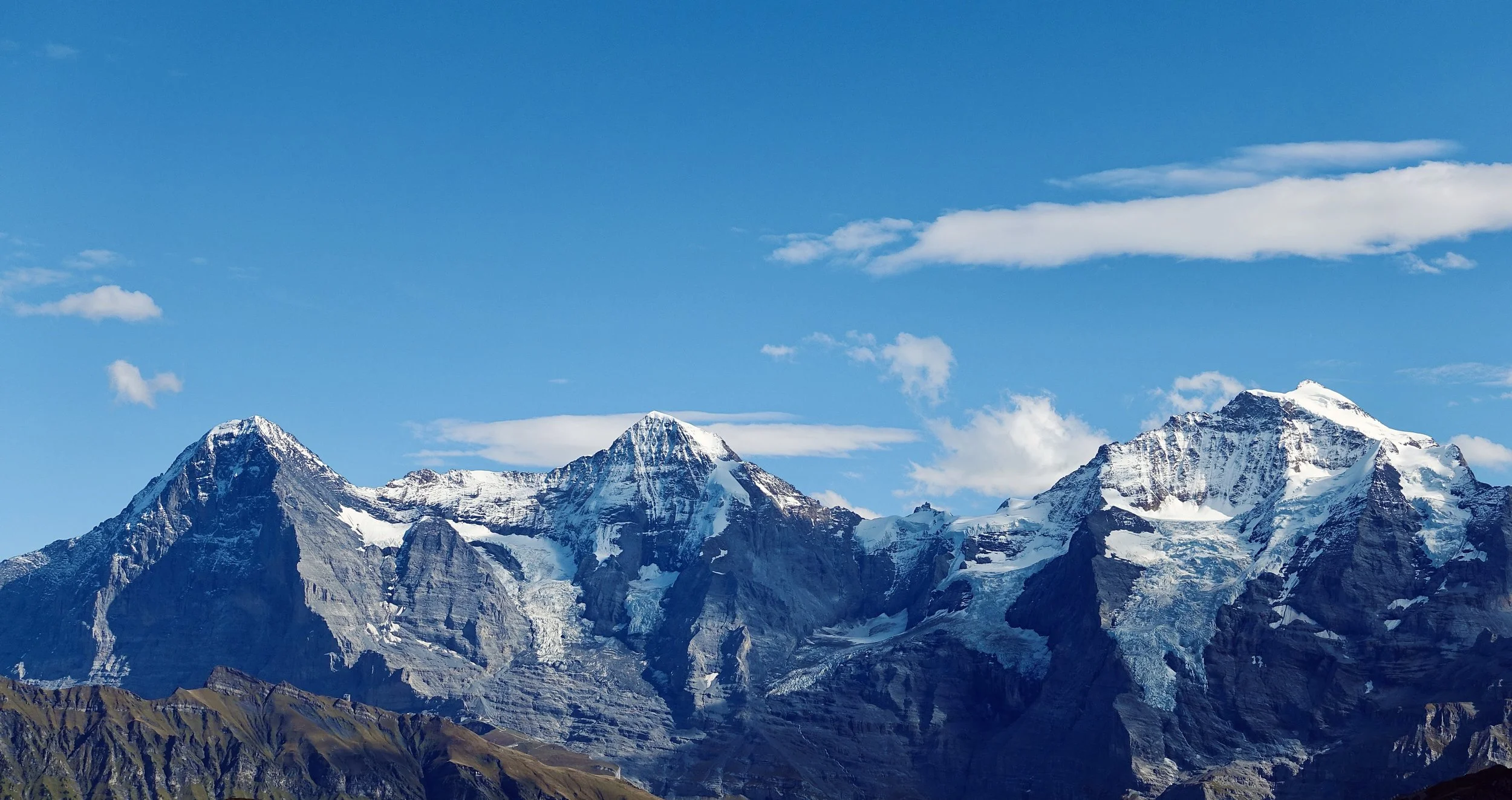 Almost immediately, the big three famous Swiss mountains - Eiger (troll), Monch (monk), and Jungfrau (young maiden) - come into view and occupy most of the horizon.